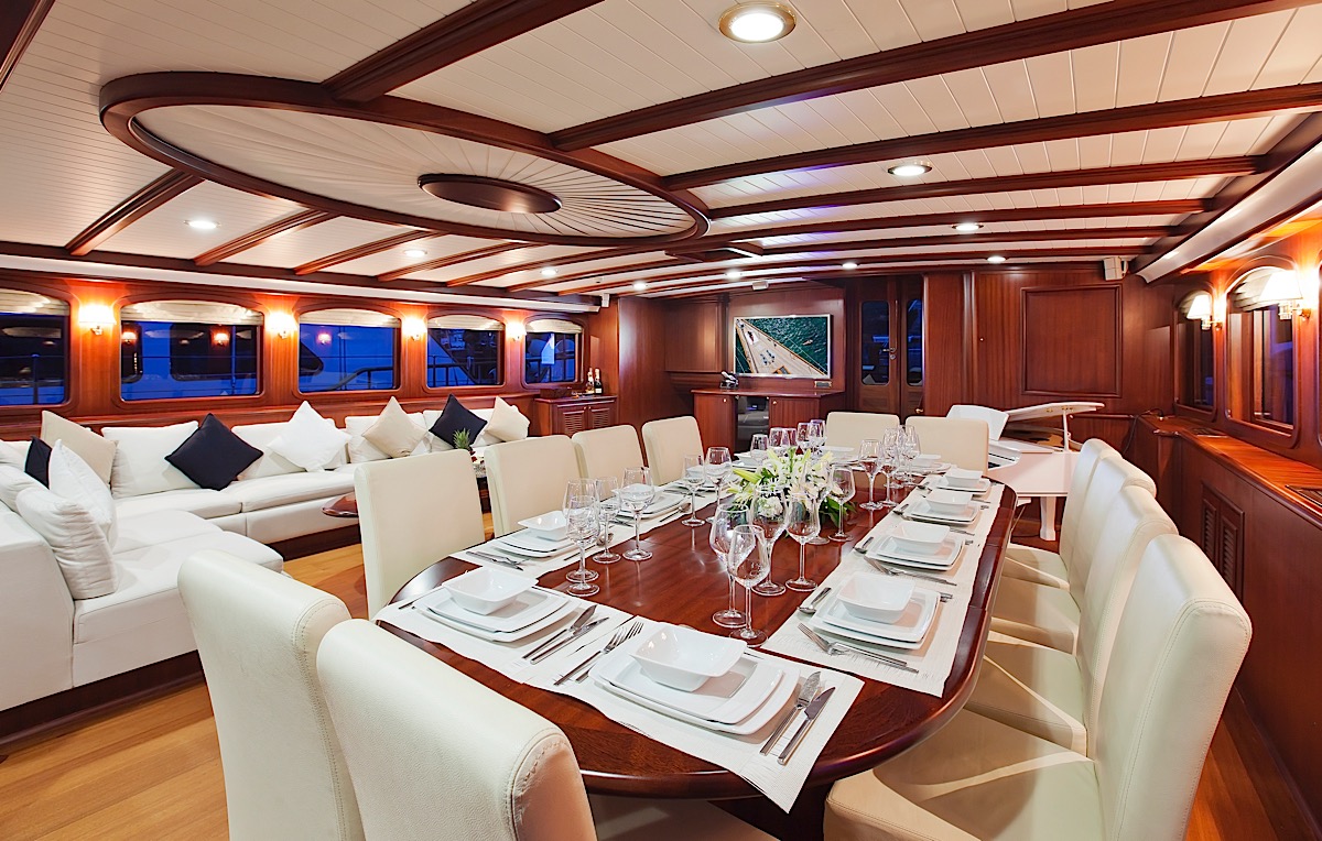6 guest cabins comprising of 2 master, 3 double VIP and 1 twin cabins each with air condition, satellite TV, DVD, surround sound music system, push flush toilets, hair dryers, fire extinguishers and smoke detectors. 5 cabins for the crew.
